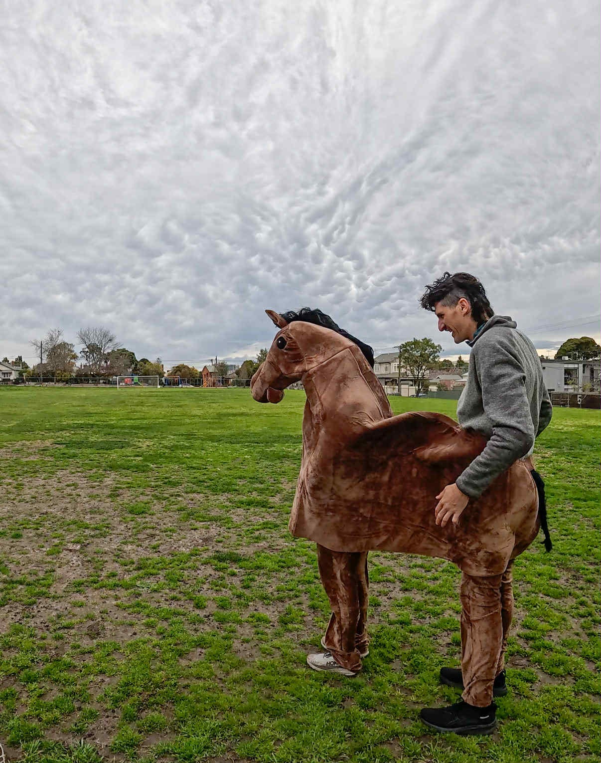 But then I started having recurring nightmares in which David ghosted me. In these dreams, I’d be running the marathon solo and have the Melbourne Cricket Ground – the finish line – in sight. I’d turn a corner and see David in our horse costume, bickering with whomever he’d recruited to replace me. I’d pass them, naturally, but this would bring me no satisfaction. Instead there was a sadness, a sense of having had something special only to have lost it.