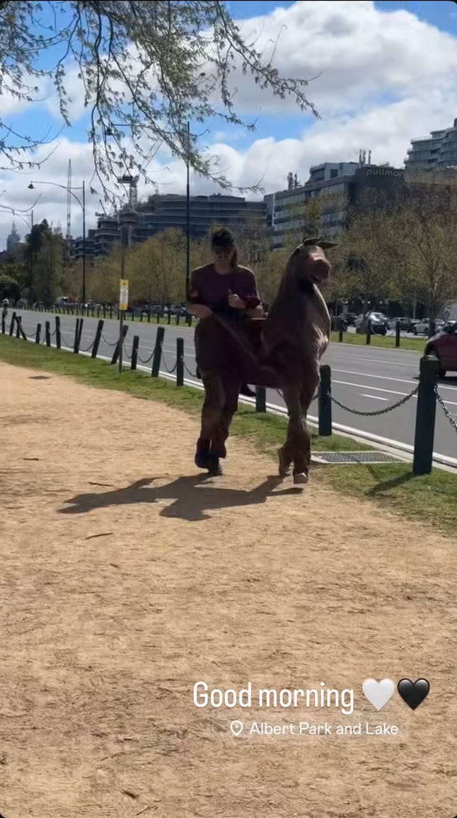 As the kilometres increased, so too did my confidence. I shared my plans with family and friends. Mentioned it to people at the gym. Four weeks out from the marathon, David and I met for a trot around Albert Park Lake to test his alterations. He’d sewn little legs to wear around his waist and the hat-inside-a-horse-head proved to be a stroke of genius.